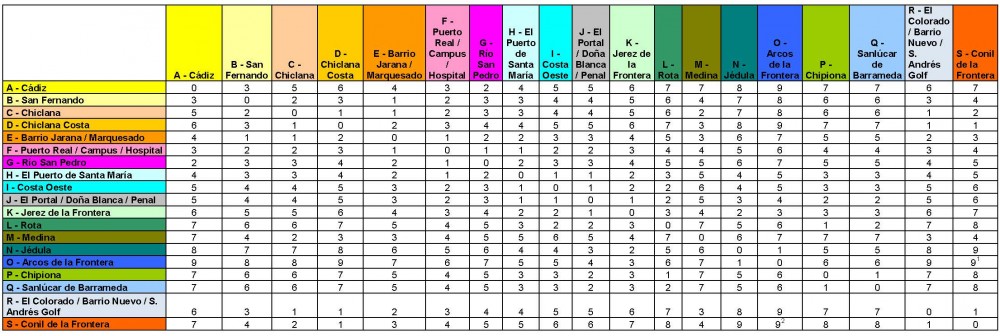 Las tarifas de cada viaje metropolitano se establecen en función del mínimo número de “saltos” que haya desde la zona origen a la zona destino, y es independiente del trayecto. El número de saltos entre zonas se obtiene del anterior mapa tarifario, y se recoge en el siguiente cuadro: