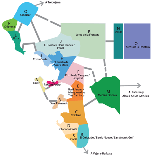 Cada zona tarifaria se identifica con una letra seguida del topónimo que identifica la zona. En la siguiente figura aparecen las zonas tarifarias y los conectores de conexión entre zonas adyacentes no consecutivas.